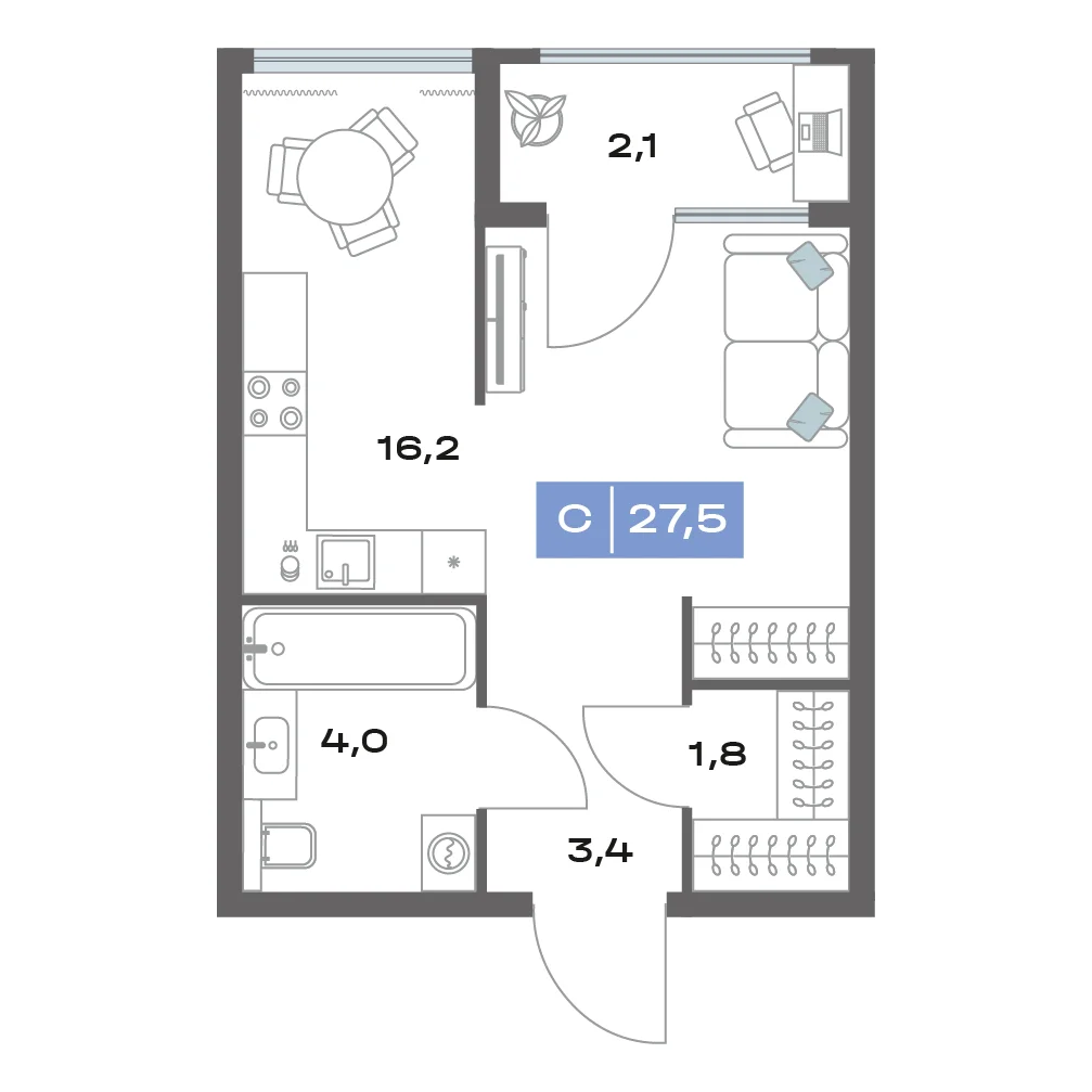 1-комнатная 27.5 м²